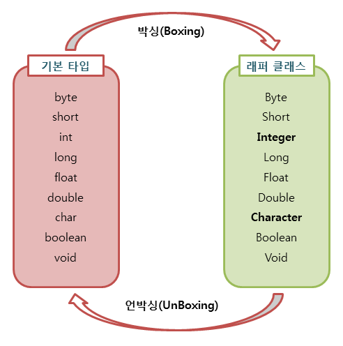 기본 타입의 값을 포장 객체로 만드는 과정을 박싱이라고 하고 반대로 포장객체에서 기본타입의 값을 얻어내는 과정을 언박싱이라고 합니다.