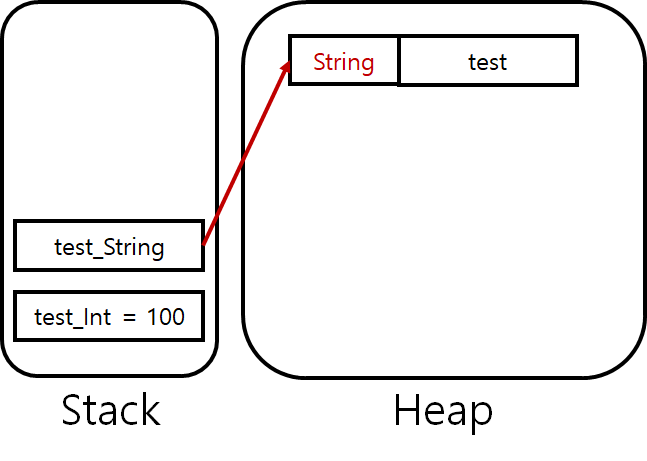 String타입은 Object를 상속받아 구현되었으므로 (Object 타입은 최상위 부모클래스다, Polymorphism 에 의해 Object 타입으로 레퍼런스 가능하다) String 은 heap 영역에 할당되고 stack 에 test_String이라는 이름으로 생성된 변수는 heap 에 있는 “test” 라는 값을 레퍼런스 하게 된다. 그림으로 표현하면 아래와 같다.