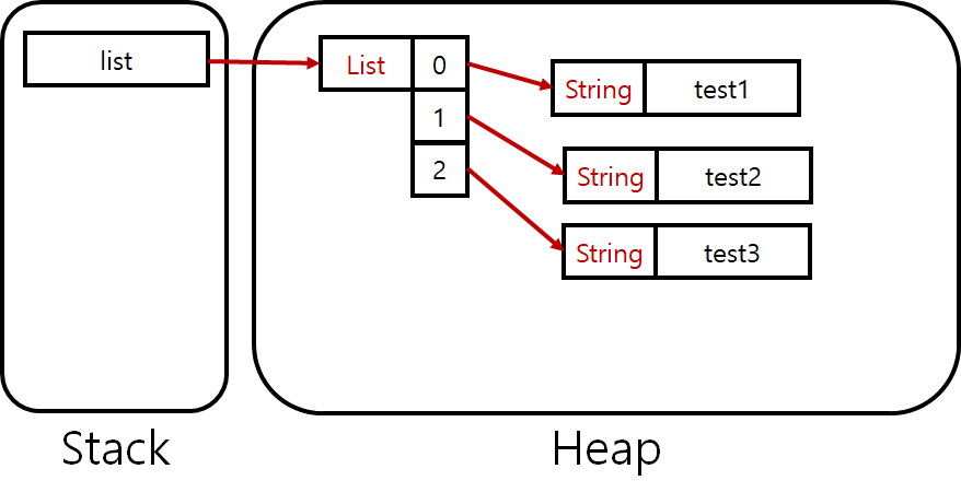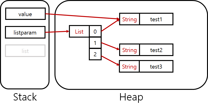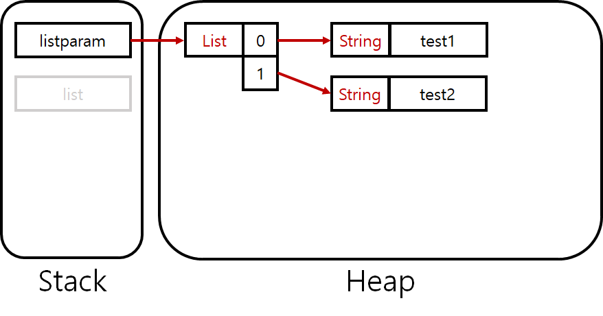 listParam 이라는 참조변수가 새롭게 stack 에 할당되어 기존 List 를 참조하게 되는데, 기존에 인자인 list가 가지고 있던 값(List 에 대한 레퍼런스)을 그대로 listParam 이 가지게 되는 것이다.