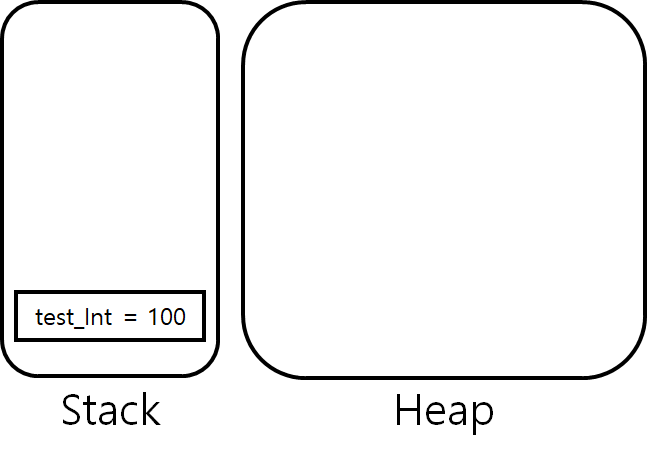 에 의해서 변수 test_Int에 100이라는 값이 Stack메모리 영역에 할당되어 메모리 상태는 아래와 같다.