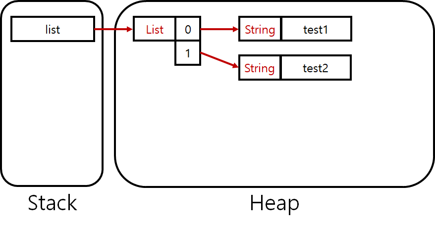 이 때 print() 함수의 scope 에서 stack 에 value 가 추가되고, 이 value 는 listParam 을 통해 List 의 0번째 요소에 접근하여 그 참조값을 가지게 된다.
