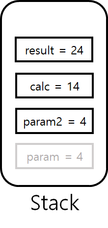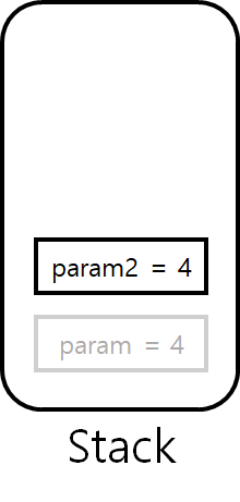 이 때 인자로 넘겨받은 갑은 파라미터인 param2에 복사되어 전달되는데, param2또한 원시 타입이므로 Stack에 할당된 공간에 값이 할당된다. 현재 Stack상태는 아래와 같다.