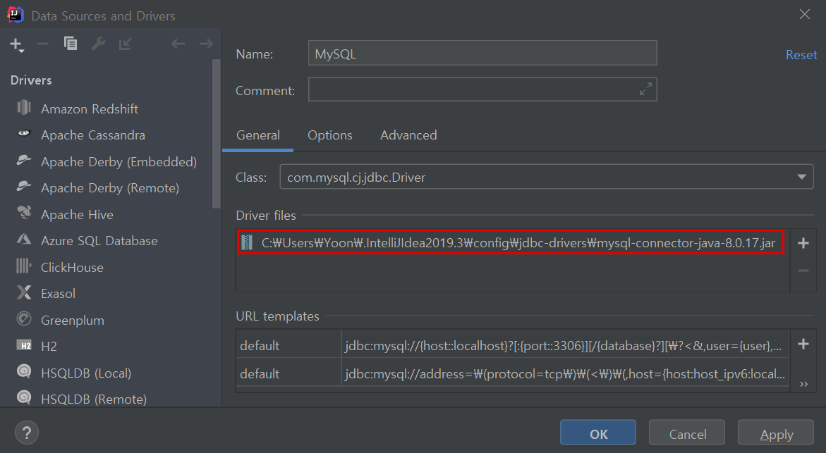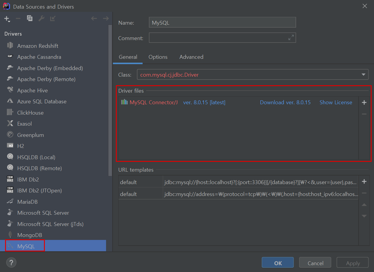 이 창에서 data source와 driver를 설정할 수 있는데 data source를 설정하기 전에 먼저 driver부터 설정해주겠다.