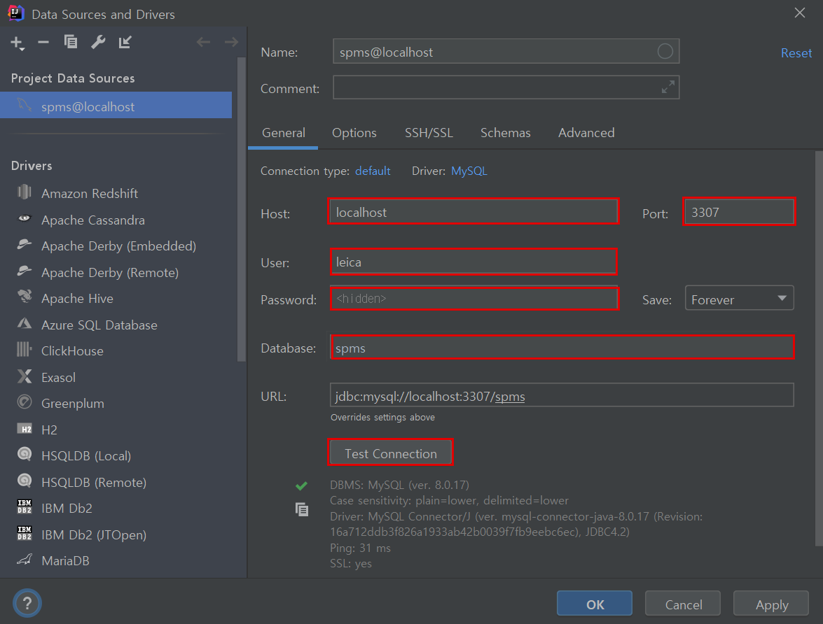 Host, Port, User, Password, Database(Schema)를 입력하고 Text Connection을 클릭하여 정상적으로 연결되는지 확인해본다.