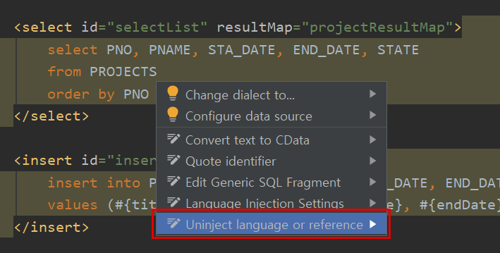 Warning이 나서 노랗게 표시된 라인에서 Alt + Enter 키를 눌러 컨텍스트 메뉴를 띄우고 Uninject language or reference를 클릭한다.