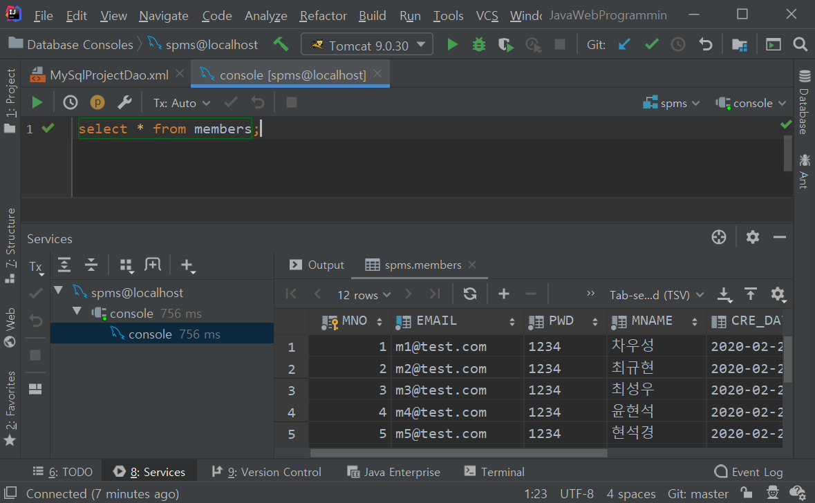 IntelliJ 상에서 database console로 SQL 명령문을 실행해볼 수 있다는 것이다.