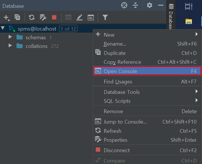 콘솔창은 database view(View - Tool Windows - Database)에서 해당 data source 우클릭 - Oepn Colsole 메뉴로 열 수 있다.