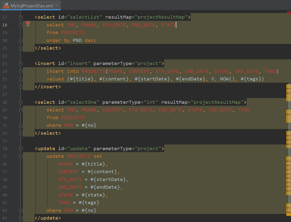하지만 IntelliJ에 SQL dialect와 data source를 설정해주면 해당 database에 대한 코드 검증, SQL 문법 검사와 자동 완성 등의 기능이 지원된다.