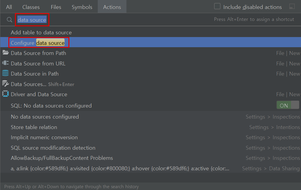 액션 검색(Ctrl + Shift + A)을 켜고 data source를 입력한 뒤 Configure data source를 클릭한다.