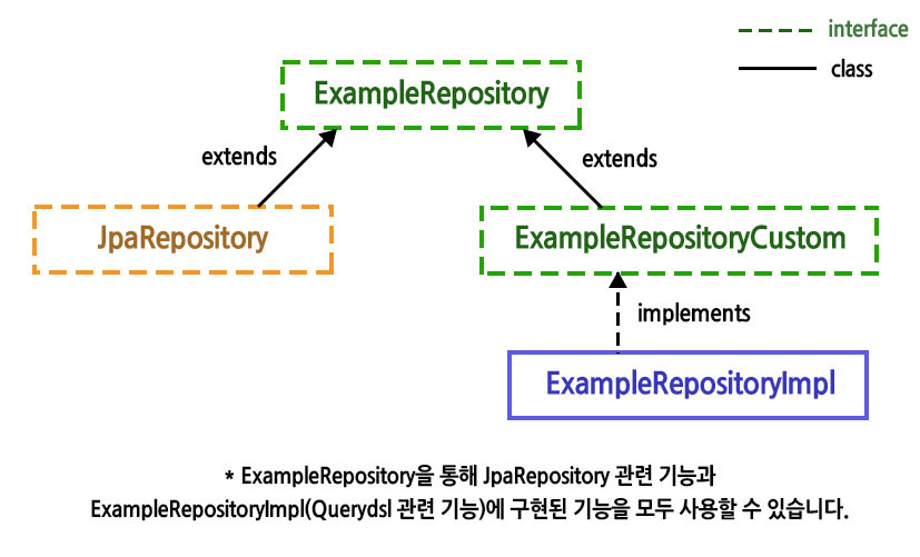 크게 JpaRepository를 extends 하는 Repository 인터페이스에 CustomRepository 인터페이스를 추가로 extends 하는데, CustomRepository 인터페이스는 Querydsl의 기능을 사용하는 RepositoryImpl 클래스를 구현체로 가지고 있습니다.