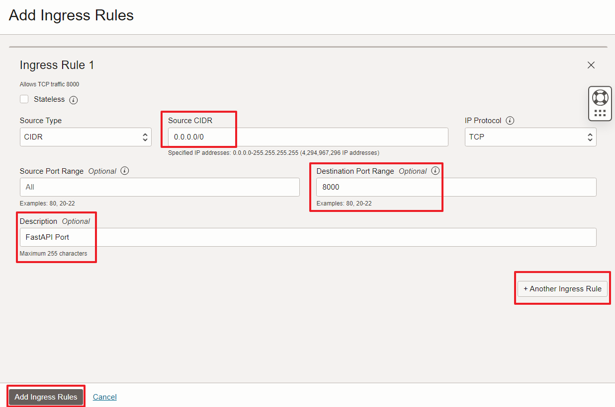 모든 접속을 허용해주기 위해 Source CIDR에 0.0.0.0/0을 입력해주고 Destination Port Range에 8000, Description에 FastAPI용 포트임을 설명해줬다.