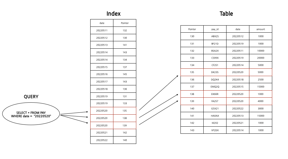 인덱스를 사용해서 이 SQL문을 처리할 때는 우선 'date'가 기록되어 있는 인덱스를 조사한다. 그 결과 pointer(talbe 저장된 위치, rowid)를 알아낼 수 있고 그 주소를 토대로 데이터를 읽을 수 있다.