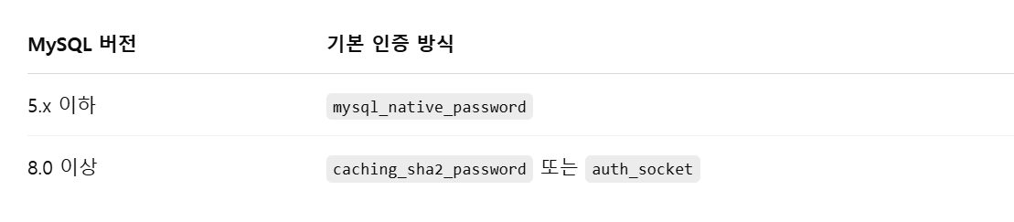 | caching_sha2_password | SHA256 기반 인증, 보안은 좋지만 호환성 이슈 있음 | ⚠️ |